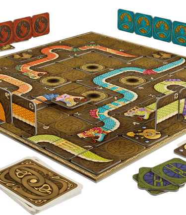 Snake Clash is a tile-laying fighting game for 2 to 4 players. Each player moves their Snake across the gameboard in pursuit of relics, engaging in stand-offs with the others. The game ends when a player finishes the Quest by collecting enough Relics and reaching the Altar, or when only one Snake is left alive. In the first part of this rulebook, players are introduced to a basic game mode that teaches the core game mechanics. Once players are comfortable, they may add Incarnations, granting access to 14 unique Snake powers.